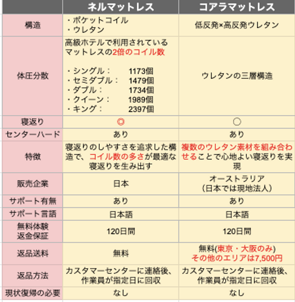 ここまで比較してきた「寝心地」「品質・サポート」などをまとめたのが次の表になります。返品送料のエリア指定なし、ポケットコイルの通気性などを踏まえると、総合的にネルマットレスの方がお得だと思います。
